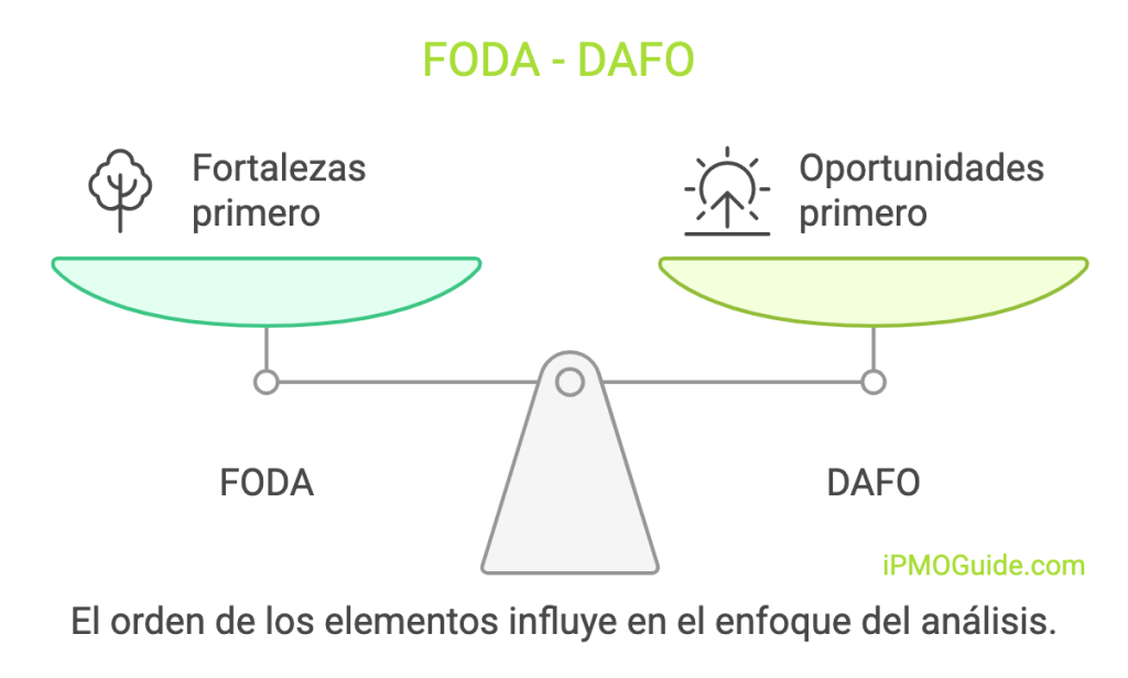 Siempre es importante saber que es un DAFO ó FODA, involucran los mismos pasos básicos y probablemente produzcan resultados similares. Sin embargo, el orden en que los gerentes, administradores ó directores piensan acerca de las fortalezas, debilidades, amenazas y oportunidades tiene un impacto en la dirección del análisis.