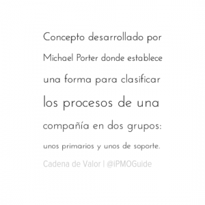 Concepto desarrollado por Michael Porter donde establece una forma para clasificar los procesos de una compañía en dos grupos: unos primarios y unos de soporte. En el grupo de procesos primarios se encuentran los procesos de logística hacia adentro, operaciones, logística hacia afuera, mercadeo, y servicio post-venta.