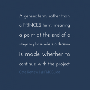 Gate Review: A generic term, rather than a PRINCE2 term, meaning a point at the end of a stage or phase where a decision is made whether to continue with the project. In PRINCE2 this would equate to an end stage assessment.