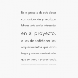 Es el proceso de establecer comunicación y realizar labores junto con los interesados en el proyecto, a los de satisfacer los requerimientos que éstos tengan y afrontar eventualidades que se vayan presentando.