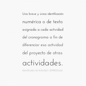 Una breve y única identificación numérica o de texto asignada a cada actividad del cronograma a fin de diferenciar esa actividad del proyecto de otras actividades.