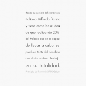 Recibe su nombre del economista italiano Vilfredo Pareto y tiene como base idea de que realizando 20% del trabajo que se es capaz de llevar a cabo, se produce 80% del beneficio que daría realizar l trabajo en su totalidad.