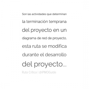 Son las actividades que determinan la terminación temprana del proyecto en un diagrama de red de proyecto, esta ruta se modifica durante el desarrollo del proyecto, depende del término de las actividades, este se calcula regularmente para todo el proyecto, sin embargo puede hacerse solo para una parte del proyecto.