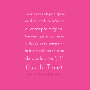 Tablero empleado para aplicar en el desarrollo de software el concepto original Kanban, que es un medio utilizado para compartir la información en entornos de producción «JIT» (Just In Time).