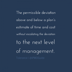 Tolerance The permissible deviation above and below a plan’s estimate of time and cost without escalating the deviation to the next level of management. Separate tolerance figures should be given for time and cost.There may also be tolerance levels for quality, scope, benefit and risk. Tolerance is applied at project, stage and team levels.