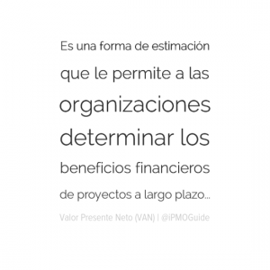 Es una forma de estimación que le permite a las organizaciones determinar los beneficios financieros de proyectos a largo plazo. Esta técnica compara los flujos de caja actuales con los mismos en el futuro, tomando en cuenta la inflación y rendimientos. Esta metodología es ampliamente utilizada en proyectos de inversión.
