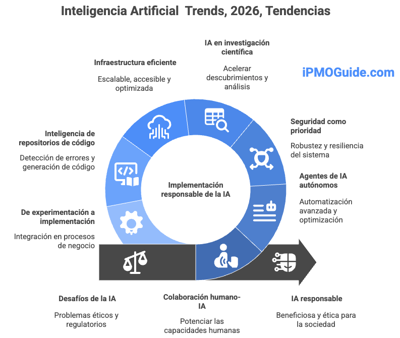 Para este 2026, basándome en las últimas fuentes mostradas para la investigación comprende un análisis, estudio y opinión por parte del Autor de la iPMOGuide.com te comparto las principales tendencias de inteligencia artificial previstas