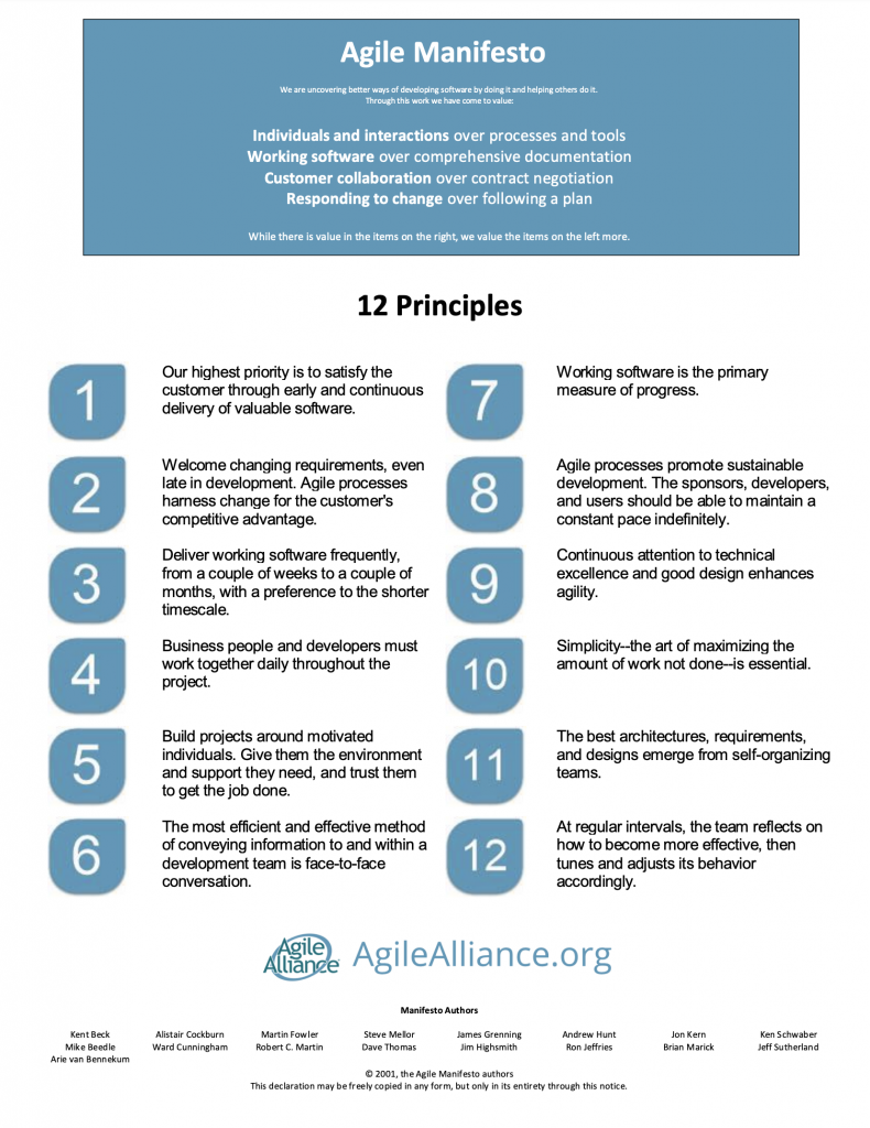 Se creó entonces la Agile Alliance, una organización sin ánimo de lucro dedicada a promover el desarrollo ágil de software y a apoyar a las organizaciones que quisieran adoptar esta nueva forma de trabajar. Para lograrlo, el primer paso que dieron fue redactar el Manifiesto Ágil, un documento que resume en cuatro valores y 12 principios la filosofía Agile.
