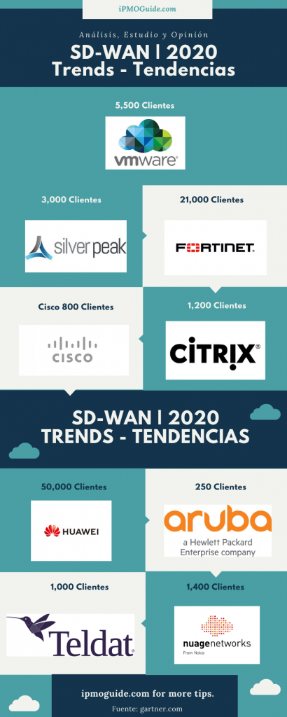 En la presente investigación de la iPMOGuide, Trend 2020, Tendencias, esta basado en el 2019 Gartner Magic Quadrant for WAN Edge Infrastructure report, donde posiciona y muy bien, la solución VMware SD-WAN™ by VeloCloud® como la numero 1 para este 2019.